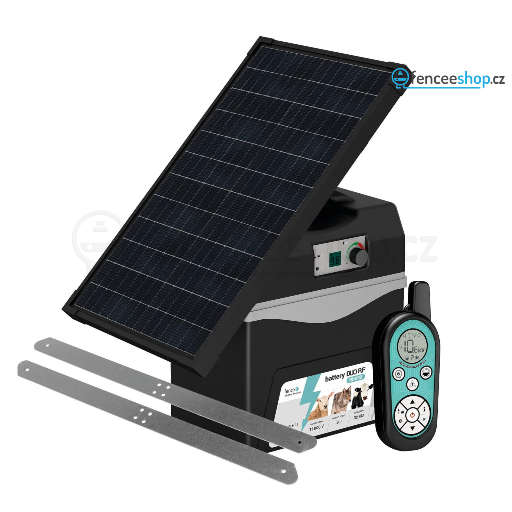 Na bateriový zdroj lze připojit solární panel s výkonem 30 W, který zajistí nepřetržitý provoz. S možností solárního dobíjení elektrického ohradníku získáte energeticky soběstačný systém, který lze provozovat i v odlehlých oblastech. Panel je upevněn pomocí montážní konzole a lze polohovat směrem ke slunci podle potřeby.