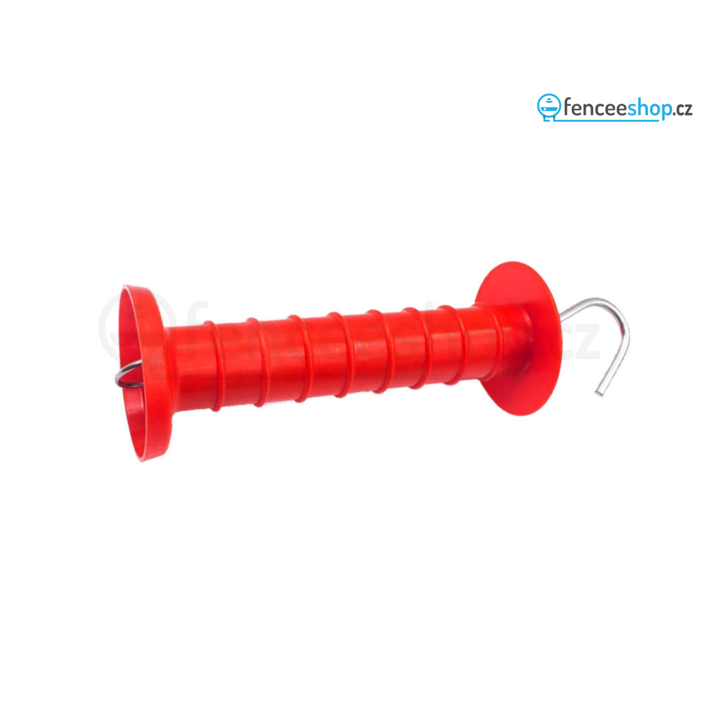 Červená rukojeť s praktickým nerezovým hákem, vhodná pro vysoké tahové síly. Odolná vůči UV záření a povětrnostním vlivům. Použitelná pro brány, příčky, paddocky apod.