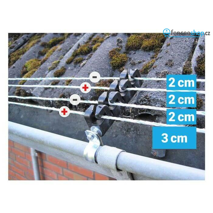 Efektivní a spolehlivá ochrana proti kunám a jiným nezvaným škůdcům. Je speciálně určený pro tzv. Plus - Mínus vedení drátů a připevňuje se přímo k okapu, k vedení 4 vodičů. Izolátor je vyroben z kvalitních stabilních materiálů, které jsou odolné všem povětrnostním podmínkám. Více informací
