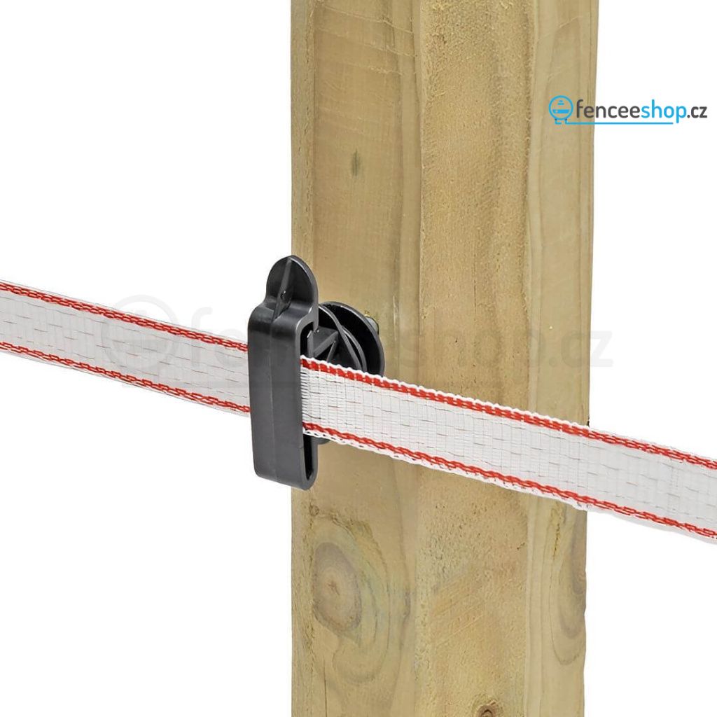 Kvalitní plastový izolátor s UV ochranou je určen pro pásky do 40 mm a lanka do ∅ 6 mm.