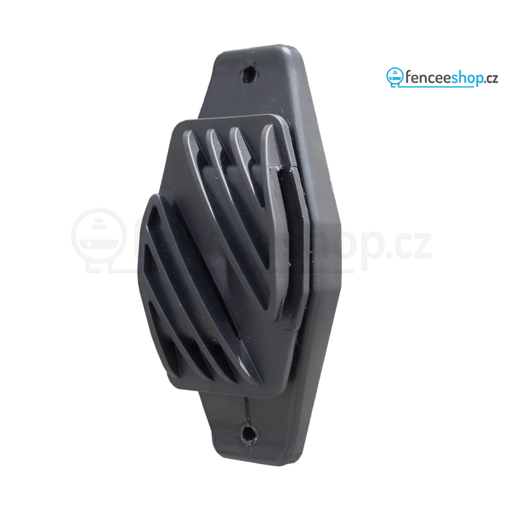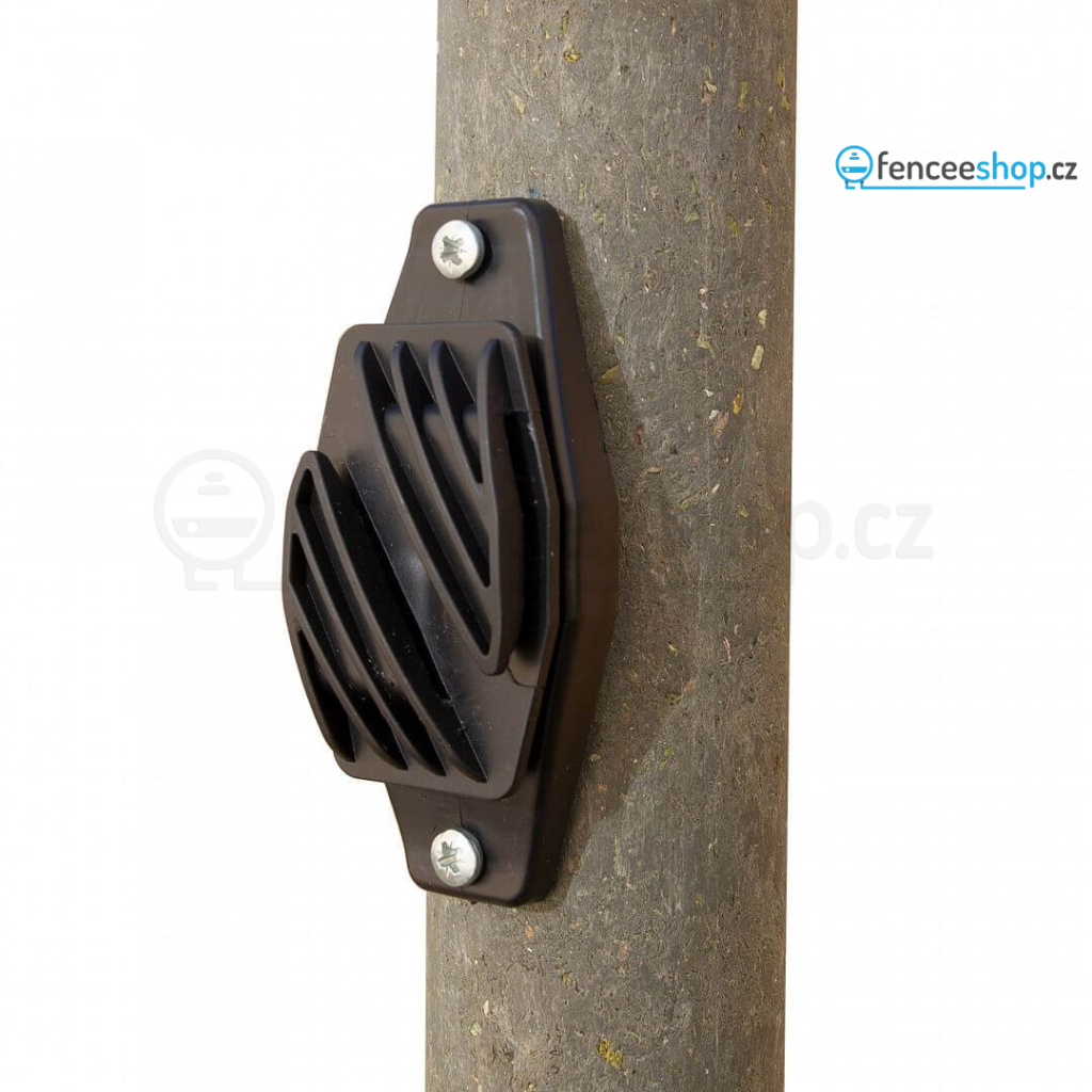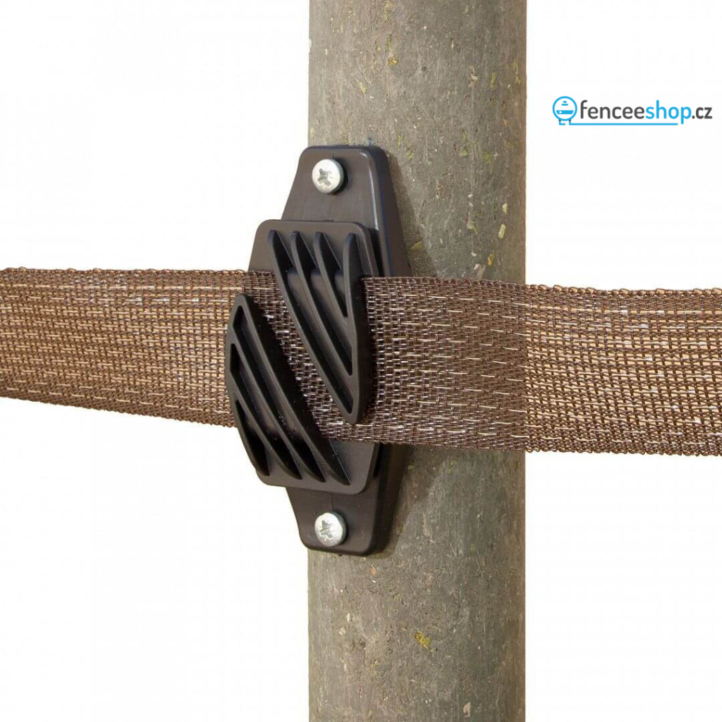 Osvědčený izolátor pro vodivou pásku. Snadno se připevňuje a bezpečně drží pásku na svém místě. Upevnění pomocí hřebíků znemožňuje krádež izolátoru.