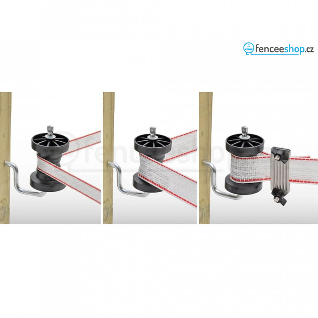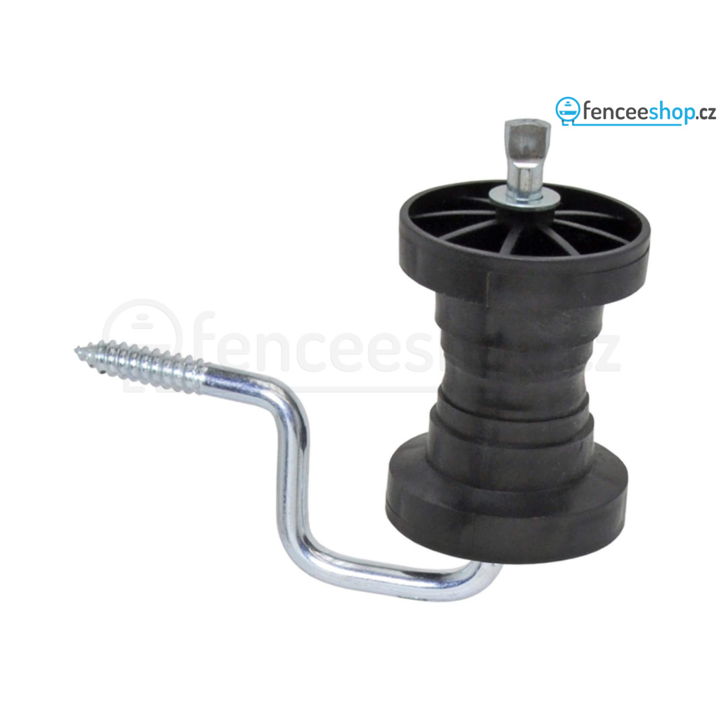 Rohový izolátor pro pásky elektrického ohradníku do šířky 40 mm. Plně otočná kladka. Kovová podpěra 7 mm. Ideální izolátor pro vedení pásky kolem rohů. Více informací