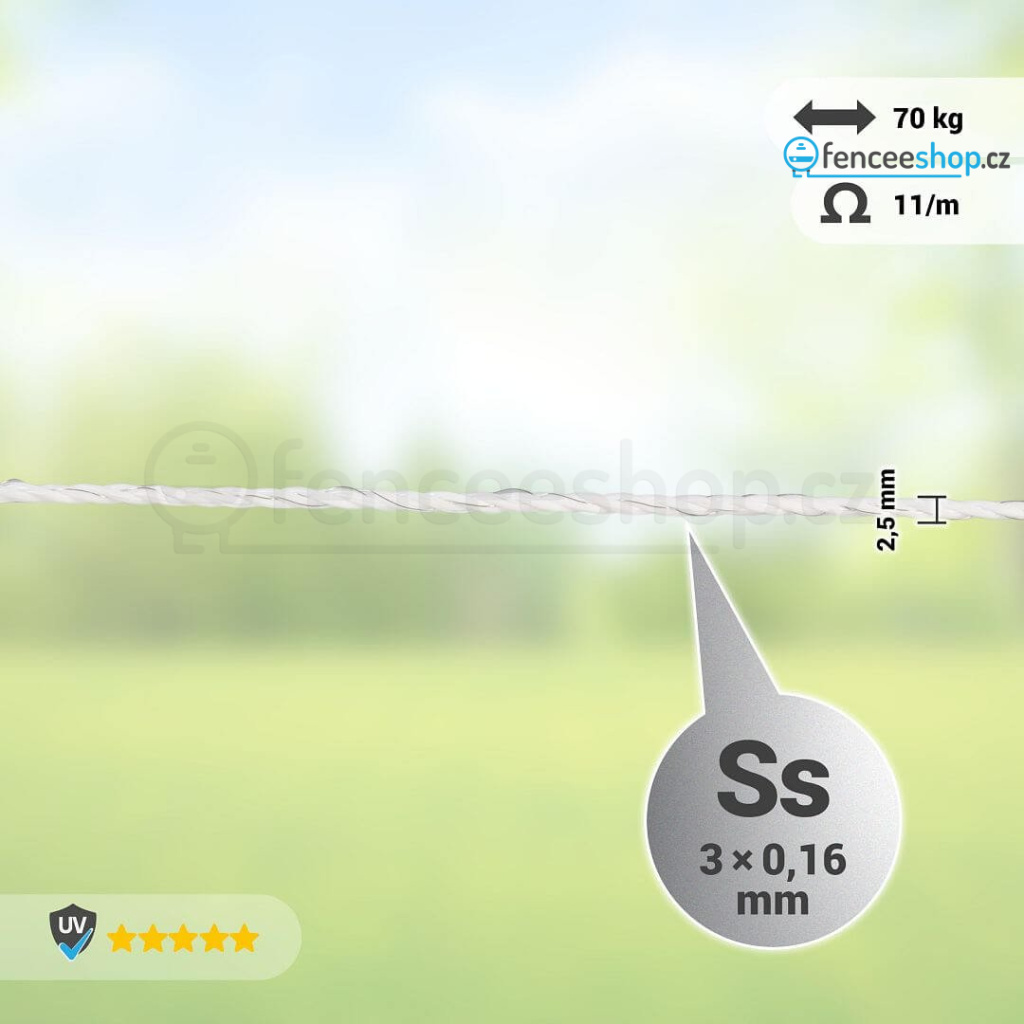 Lanko je vybaveno 3 nerezovými vodiči o průměru 0,16 mm, které zajišťují spolehlivý přenos elektrického impulsu s odporem 11 Ω/m. Je vyrobeno z pevného materiálu, který je odolný vůči roztržení a povětrnostním vlivům.