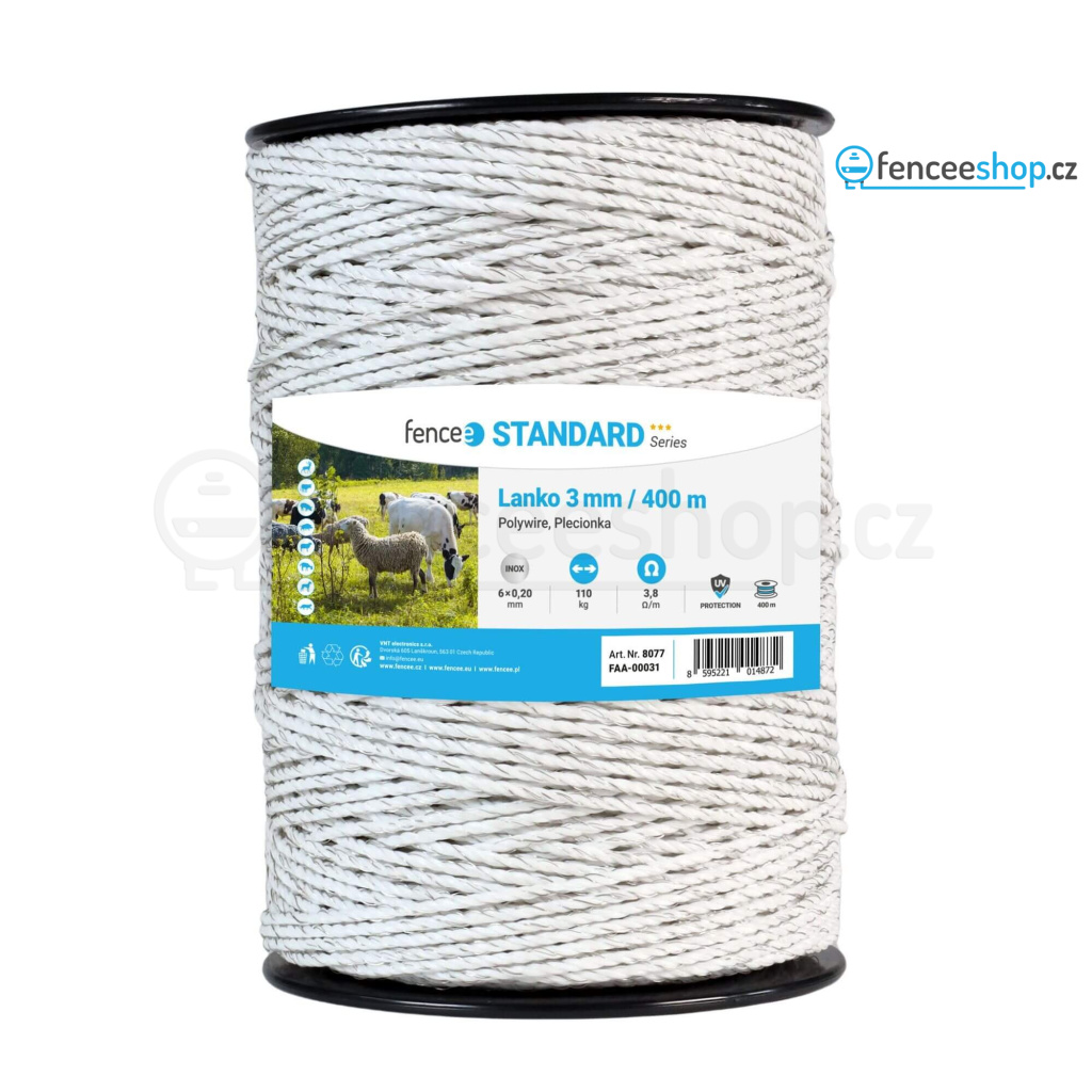 Kvalitní vodivé lanko určené pro univerzální použití u elektrických ohradníků. Díky šesti silným nerezovým vodičům 6 × 0,20 mm je toto lanko univerzální, robustní a odolné. Pro kratší a středně dlouhé ohrady. Dlouhá životnost, odpor pouze 3,8 Ω/m. Více informací