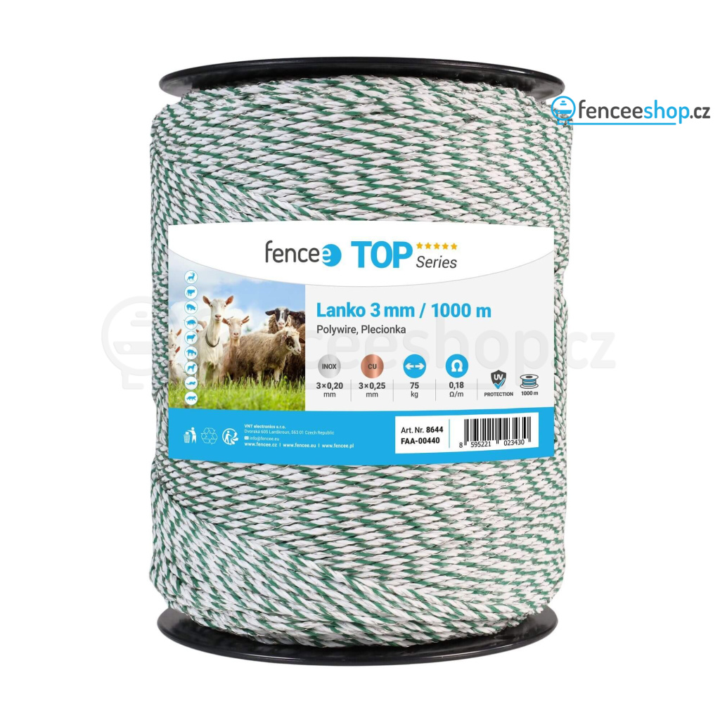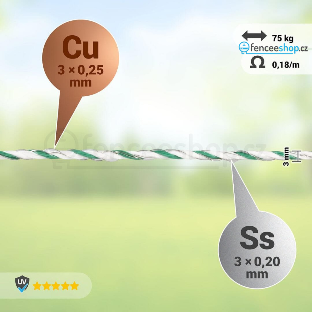 Velice kvalitní vodivé lanko určené pro univerzální použití u elektrických ohradníků. Je vyrobeno z pevného materiálu, odolného proti roztržení. Odpor pouze 0,1 Ω/m. Pevné nerezové 3 × 0,20 mm, měď 3 × 0,25 mm. Špičková kvalita. Vhodné pro dlouhé ohrady. Více informací