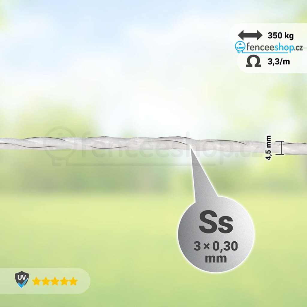 Kvalitní vodivé lano vyrobené z polypropylenu určené pro použití u elektrických ohradníků. Vysoká odolnost proti roztržení. Délka 200 m. UV ochrana. Díky třem silným nerezovým vodičům je univerzální, robustní a odolné. Vhodné pro krátké a středně dlouhé ohrady. Více informací