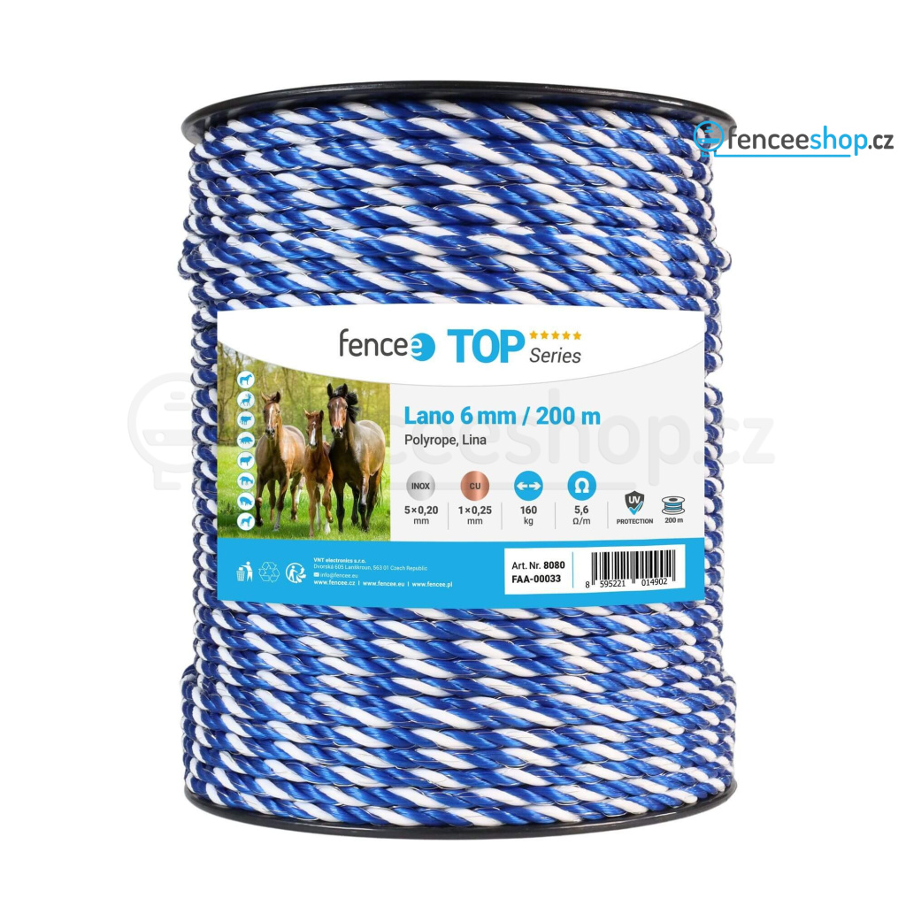 Velmi kvalitní vodivé lano vyrobené z polypropylenu určené pro použití u elektrických ohradníků. Odpor pouze 0,4 Ω/m. Vysoká odolnost proti roztržení. Pocínovaný měděný vodič uvnitř pro maximální vodivost. Délka 200 m. Vhodné i pro dlouhé ohrady.