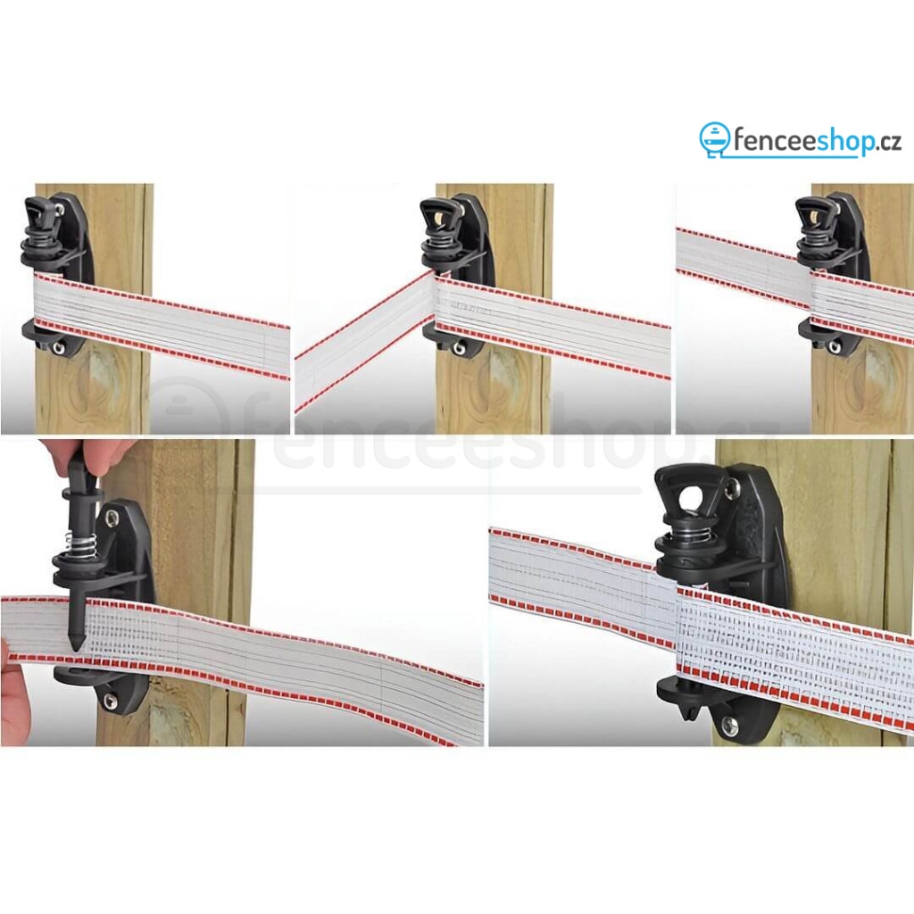 Napínací plastový izolátor pro vodivou pásku s šířkou do 40 mm. Uchycení pomocí dvou šroubů. Snadné napínání/utahování ohradníkové pásky. Elektrická páska se nekroutí, což zvyšuje její životnost. Vyztuženo skelnými vlákny. Pásku lze kdykoliv dotáhnout. Více informací