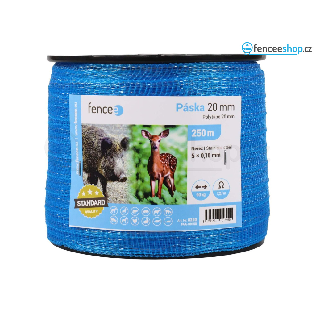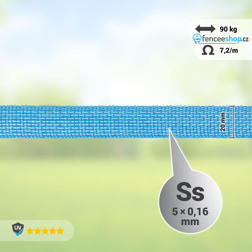 Odolná ohradníková páska s UV ochranou pro vymezení prostoru elektrického ohradníku pro koně. Vhodná ohradníková modrá páska pro ochranu úrody, pozemku před lesní zvěří, divokými prasaty a vysoké zvěři. 5 × 0,16 mm pevný nerezový vodič. Univerzální použití pro běžné instalace. Pro kratší a středně dlouhé ohrady. Odpor 7,2 Ω/m. Více informací