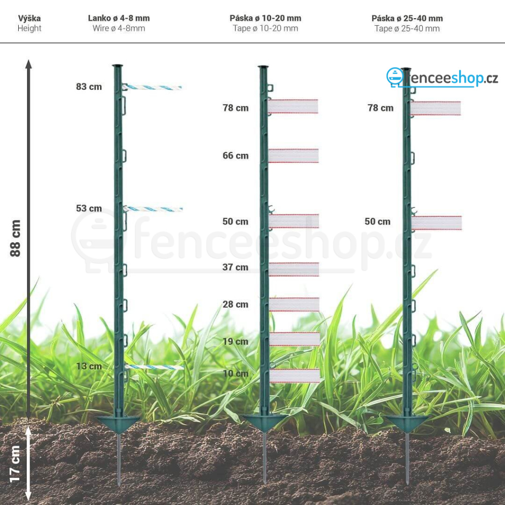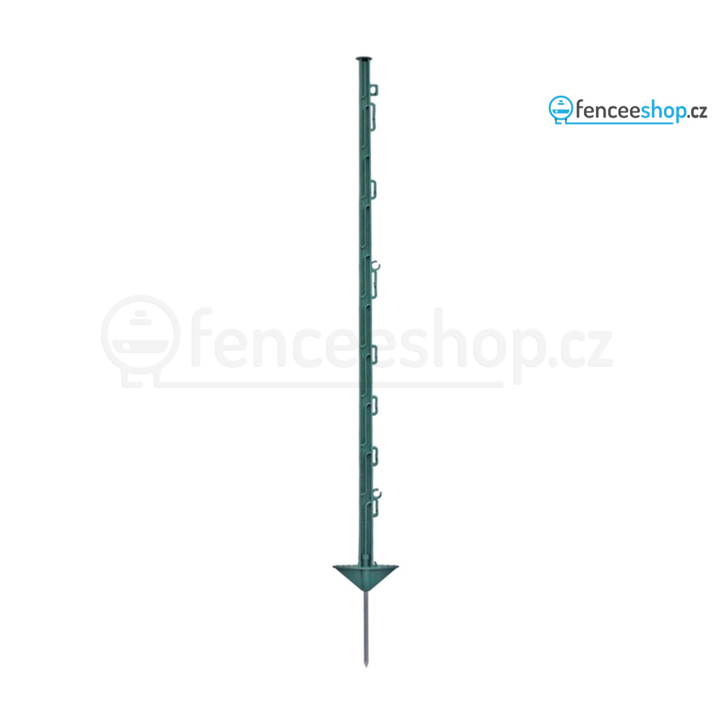 Plastový sloupek pro elektrický ohradník v přírodní zelené barvě s 10 očky pro vodiče elektrického ohradníku. Celková výška sloupku 105 cm, výška nad zemí 88 cm. Díky materiálu ze skleněných vláken je velmi odolný proti zlomení a snadno se instaluje pomocí kovové špice se dvěma nášlapy. Více informací