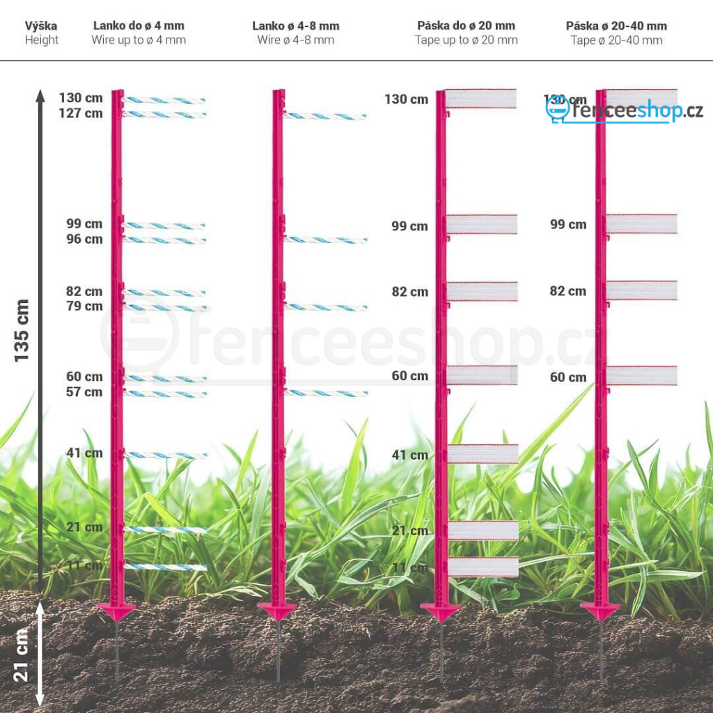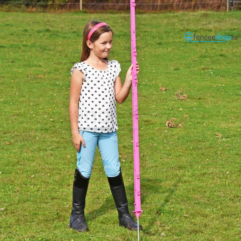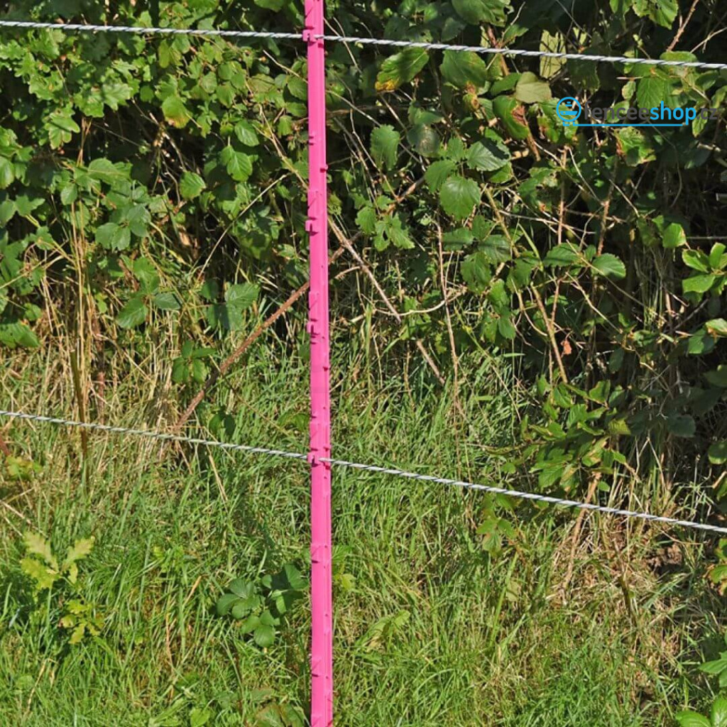 Vysoký růžový plastový sloupek pro elektrický ohradník. Celkem 11 oček pro vodiče ohradníku. Kvalitní materiál s vyztužením ze skelných vláken a vysokou UV stabilitou. Odolnost proti ohýbání a zlomení. Délka sloupku 156 cm, výška nad zemí 135 cm. Více informací