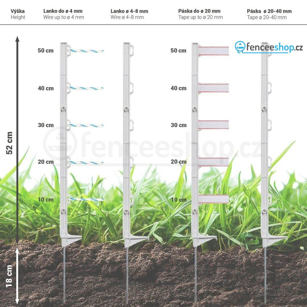 Univerzální plastová tyčka pro elektrický ohradník v bílé barvě s 5 očky pro standardní běžné vodiče elektrického ohradníku. Tyčka je vhodná pro vymezení dočasného i trvalého prostoru elektrického ohradníku.