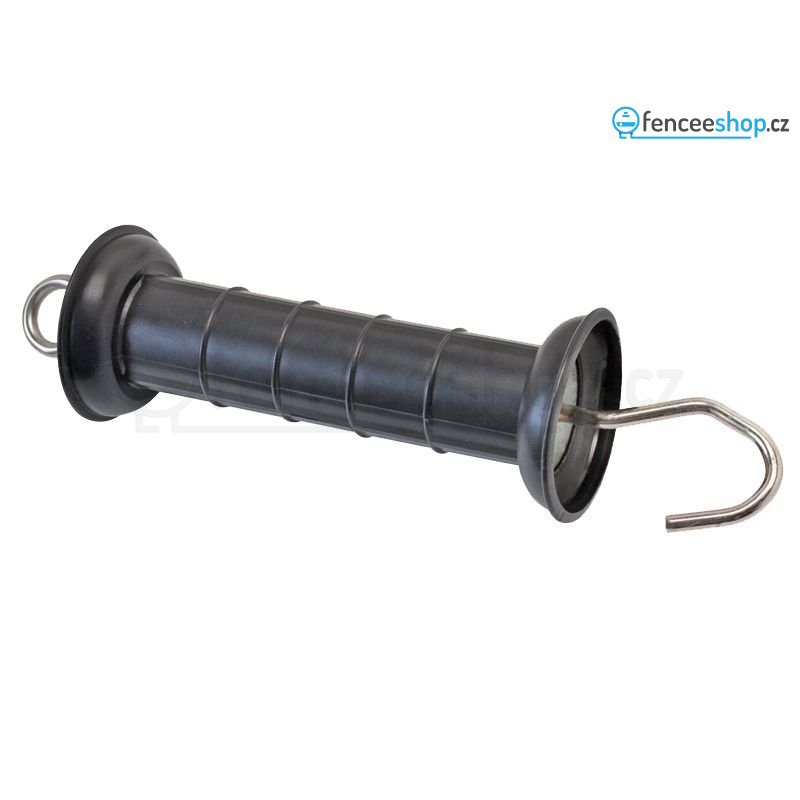 Černá rukojeť s praktickým nerezovým hákem, vhodná pro vysoké tahové síly. Odolná vůči UV záření a povětrnostním vlivům. Použitelná pro brány, příčky, paddocky apod.