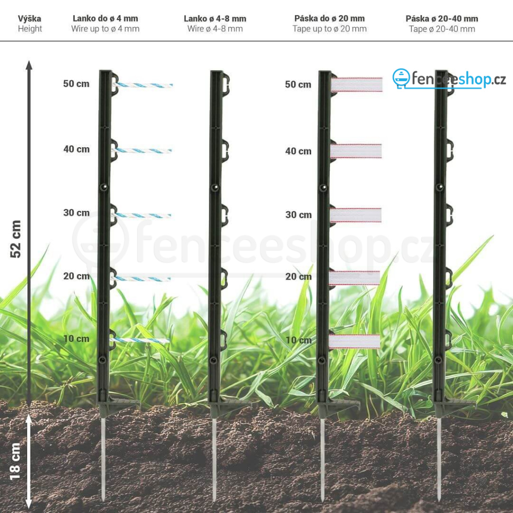 Univerzální plastový sloupek v tmavě zelené barvě splyne nerušeně s okolím zahrady a umožní Vám instalaci ohradníku s maximální výškou 52 cm nad zemí. Sloupek má 5 oček pro snadné provléknutí ohradníkových vodičů.