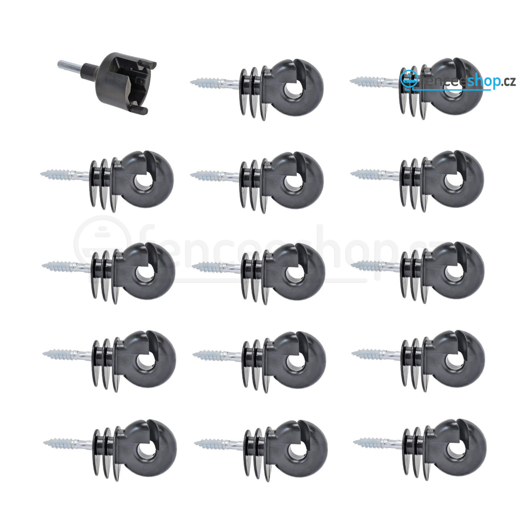 Velké balení celkem 250 ks kruhových izolátorů pro elektrický ohradník včetně montážní hlavice na vrtačku pro instalaci různých typů izolátorů do kůlů. Izolátory s 6mm vrutem. Více informací