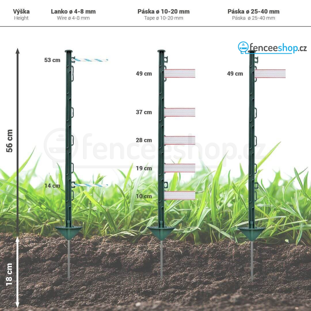 Kvalitní diskrétní zelené lanko 100 metrů s průměrem 2,5 mm. Výšku ohrazení až 56 cm nad zemí vytvoříte pomocí pevných plastových sloupků se 7 očky pro individuální volbu tažení vodičů. Mobilní plastové sloupky je možné snadno přemisťovat. Nechybí ani zemnící tyč pro uzemnění ohradníku.