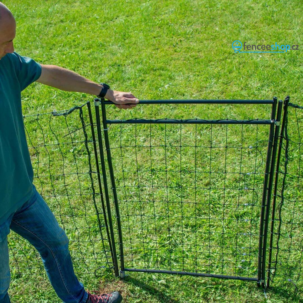 Vrátka k ohradním sítím pro elektrické ohradníky. Slouží k rychlému a snadnému průchodu do výběhu. Díky odizolovanému rámu nemusíte branku odpojovat od ohrady při každém otvírání a zavírání.