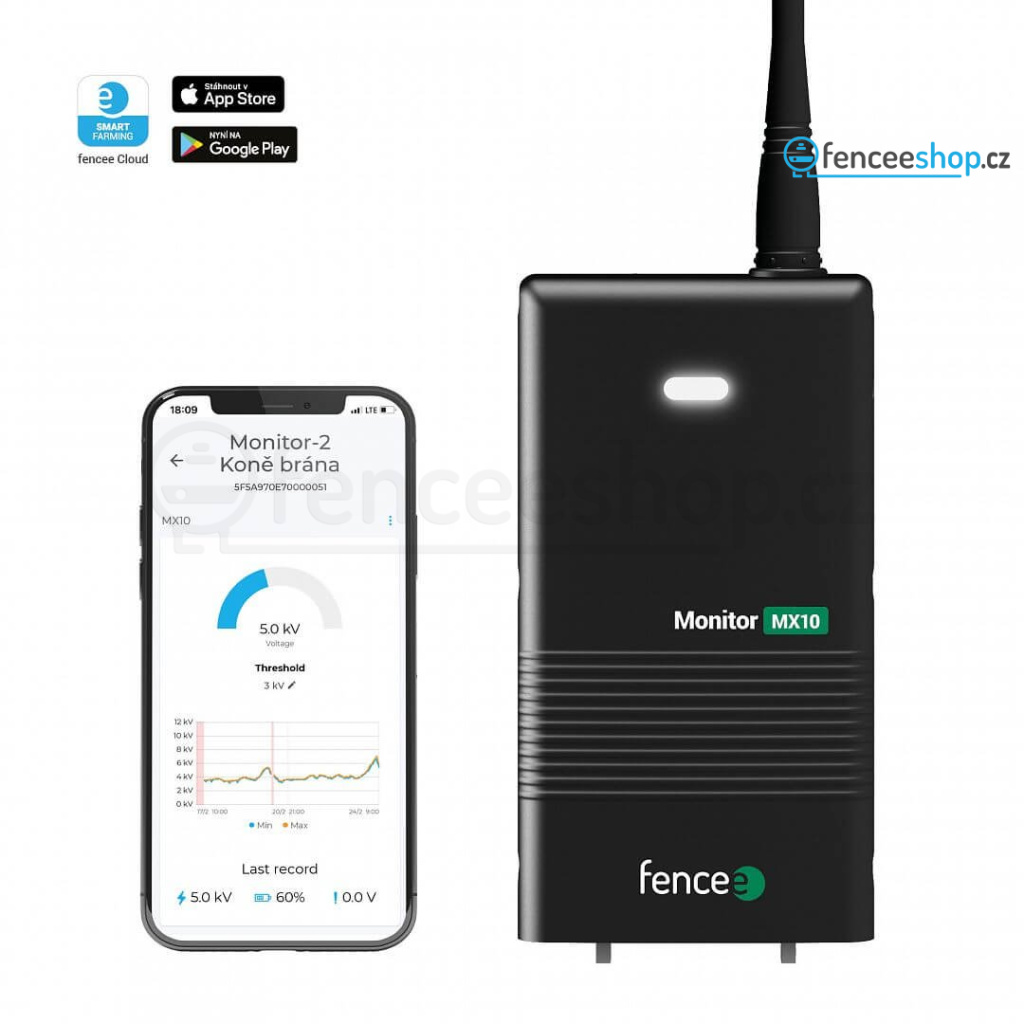 V sadě na vás bude čekat také kontrolní Monitor MX10. Po připojení na elektrickou ohradu měří hodnotu napětí. V případě poklesu pod nastavenou hodnotu odesílá upozornění do centrální Gateway, která ihned spustí on-line alarm o vzniklém poklesu napětí na ohradě. Spárovaný Monitor MX10 ovládáte vzdáleně pomocí mobilní aplikace. Kontrolní monitory mají mnoho způsobů instalace, pokud se chcete dozvědět více, přečtěte si článek o různém zapojení kontrolních Monitorů.