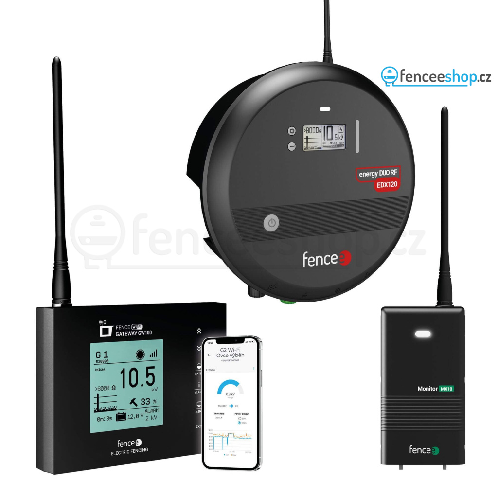 Sada chytrého elektrického ohradníku s kombinovaným RF generátorem energy DUO RF EDX120 s výkonem až 12 J a centrální jednotkou FENCE WiFi GATEWAY GW100. Sada je připravená k okamžitému připojení na fencee Cloud a vzdálenému ovládání mobilním telefonem nebo z PC. Výkonný chytrý zdroj elektrického ohradníku je vhodný i pro velmi dlouhé ohrady až 100 km a lze použít pro všechny druhy zvířat. V sadě je i kontrolní zařízení Monitor MX10, který dostanete zcela zdarma. Více informací