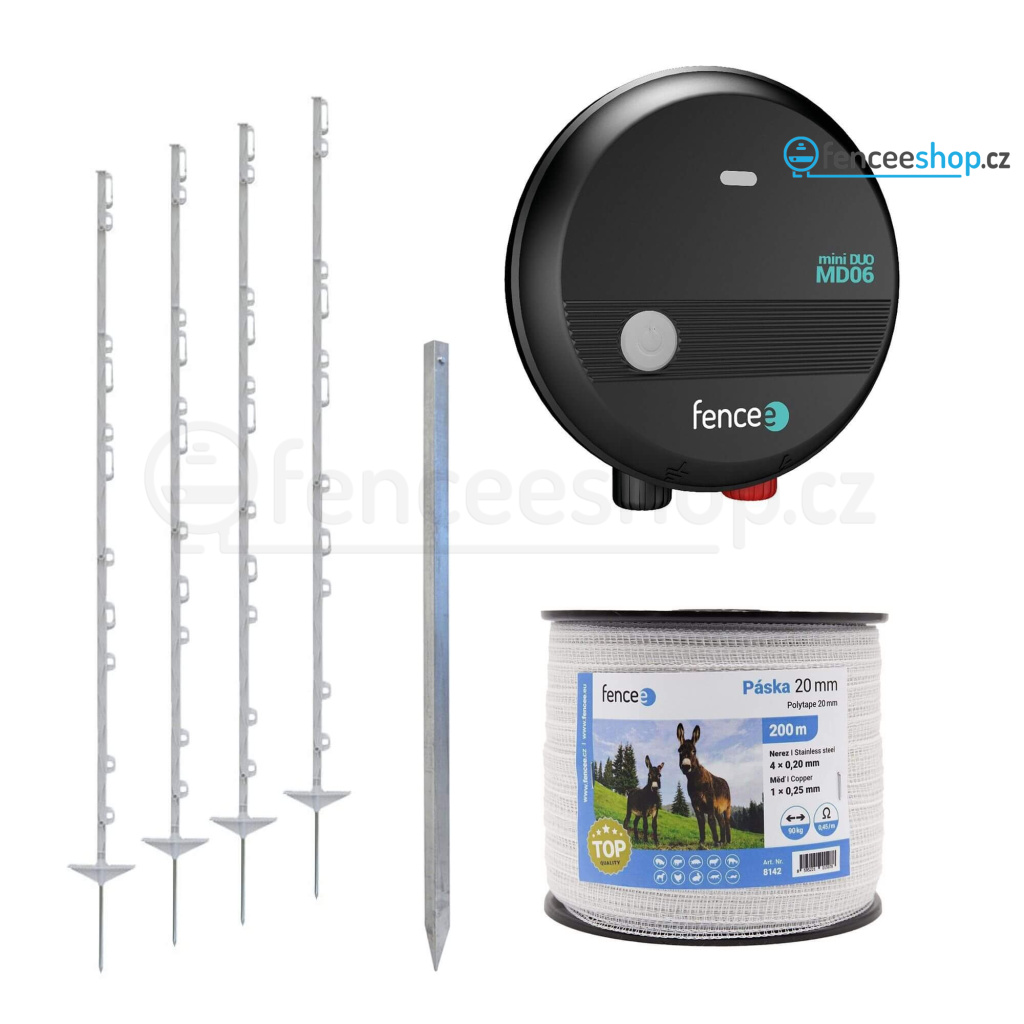 Kompletní sada mobilního elektrického ohradníku s kvalitní bílou páskou 200 m (odpor pouze 0,45 Ω/m) a vyššími plastovými sloupky 156 cm (136 cm nad zemí) určená pro citlivější zvířata. Zejména pro psy, koně a poníky. Přenosný zdroj ohradníku s kombinovaným napájením 230 V/12 V lze použít také jako bateriový ohradník. Výkon generátoru 0,6 J. Generátorem lze napájet ohradu dlouhou až 7 km. Více informací