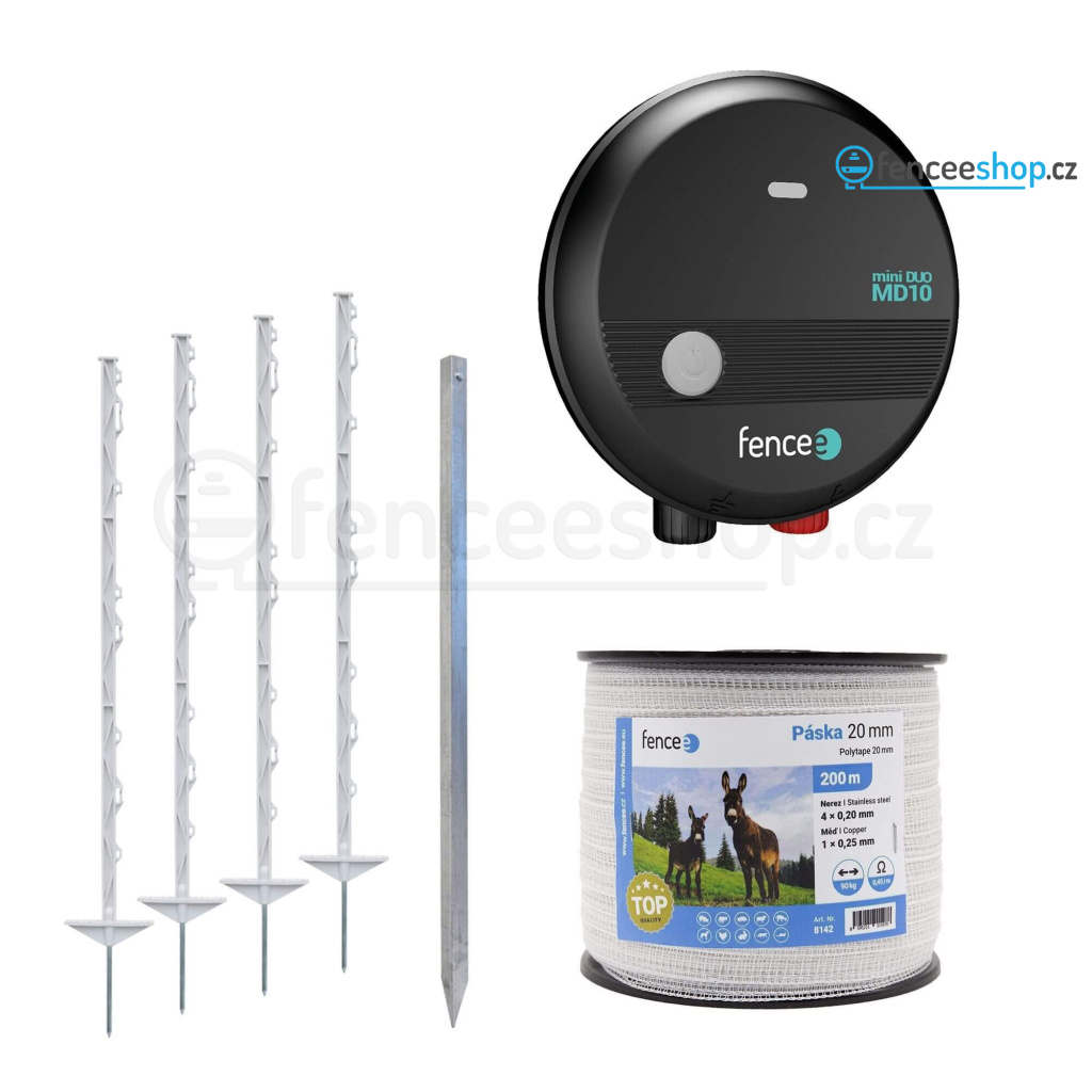 Kompletní sada elektrického ohradníku s bílou vodivou páskou 200 m a plastovými sloupky 105 cm (86 cm nad zemí) vhodná pro citlivější zvířata a koně. Ohradník lze využít také k ochraně pozemků, chovných jezírek, zahradních rybníčků, králíkáren a kurníků před škůdci a predátory – vydra, kuna, kočka, volavka a liška. Kombinovaný zdroj ohradníku mini DUO MD10 s výkonem 1 J, který lze použít jako bateriový ohradník má nízkou spotřebou a možnost přepnutí do úsporného režimu. Generátor lze použít pro Více informací