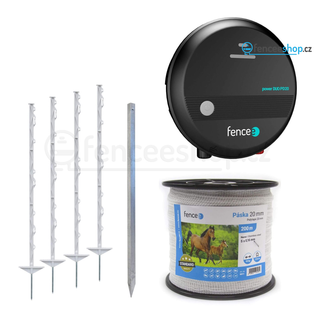 Kompletní set elektrického ohradníku určený pro koně, poníky, osly, psy a skot. Možno použít také pro ochranu před škůdci a predátory - ochrana před kunou, vydrou, lasičkou, liškou, zajícem, srnkou. Kompletní sada s kombinovaným generátorem fencee power DUO PD20 o výkonu 2 J, je vhodná pro ohrady do 15 km. Součástí balení je odolná ohradníková páska s šířkou 20 mm a pěti pevnými nerezovými vodiči. Výšku ohrazení až 86 cm nad zemí zajistí plastové sloupky s 8 očky. Více informací
