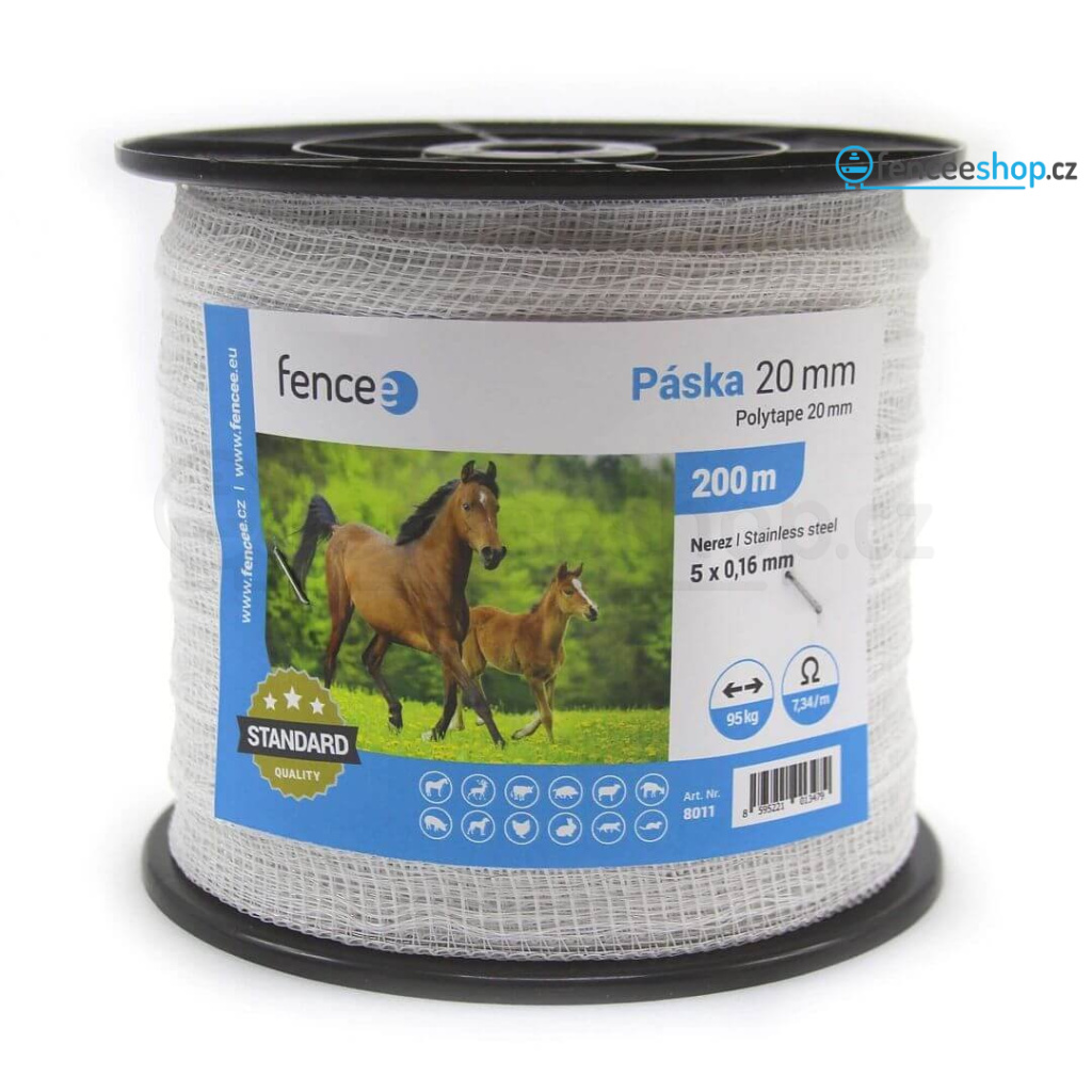 Kvalitní bílá páska v návinu 200 m s 5 nerezovými vodiči, zajistí dobrou vodivost po celé délce ohrazení. Páska je bezpečnou variantou při stavbě ohradníků pro koně, poníky a oslíky. Nehrozí jim poranění při střetu s vodičem. Plastové mobilní sloupky s 8 očky a pevnou kovovou špicí, umožní instalaci vodiče do výšky až 86 cm nad zemí.