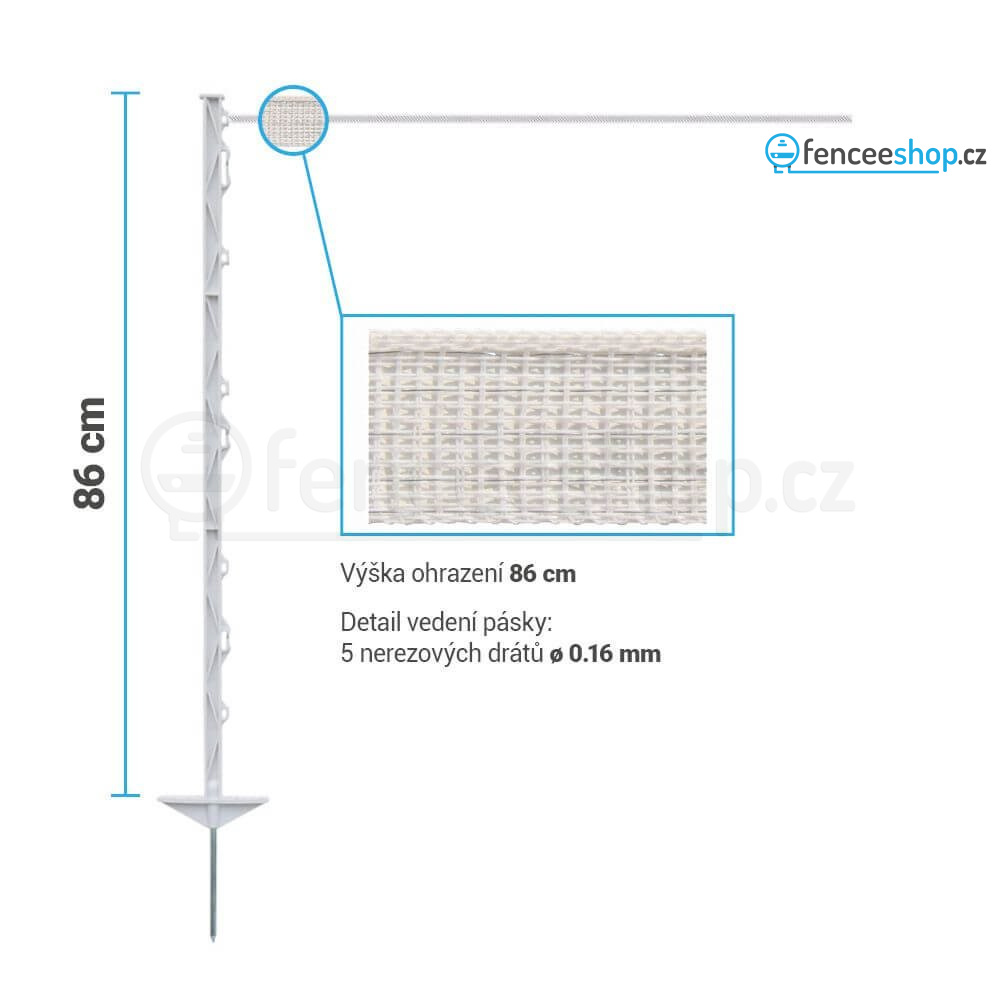 Kvalitní bílá páska v návinu 200 m s 5 nerezovými vodiči, zajistí dobrou vodivost po celé délce ohrazení. Páska je bezpečnou variantou při stavbě ohradníků pro koně, poníky a oslíky. Nehrozí jim poranění při střetu s vodičem. Plastové mobilní sloupky s 8 očky a pevnou kovovou špicí, umožní instalaci vodiče do výšky až 86 cm nad zemí.