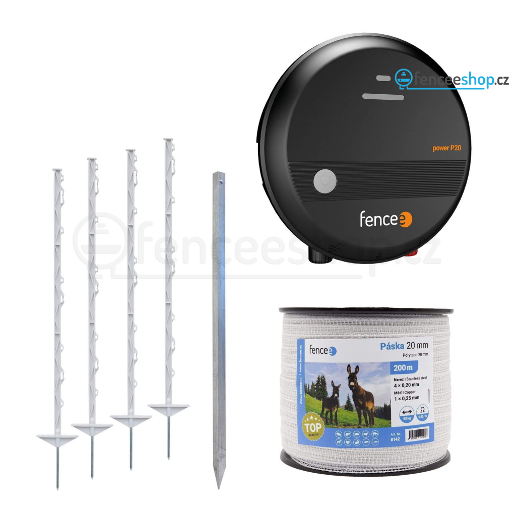 Ohradníková sada určená hlavně pro koně, poníky, psy a krávy. Lze použít také pro ochranu zahrad a polí před škůdci, např. lesní zvěř, srnky, jeleni, lišky a divoká prasata. Kompletní sada se spolehlivým síťovým generátor elektrického ohradníku power P20 s výkonem 2 J, kterým lze napájet ohrady dlouhé až 19 km. Součástí balení je odolná ohradníková páska s šířkou 20 mm a nízkým odporem 0,45 Ω/m. Výšku ohrazení až 86 cm nad zemí zajistí plastové sloupky s 8 očky. Více informací