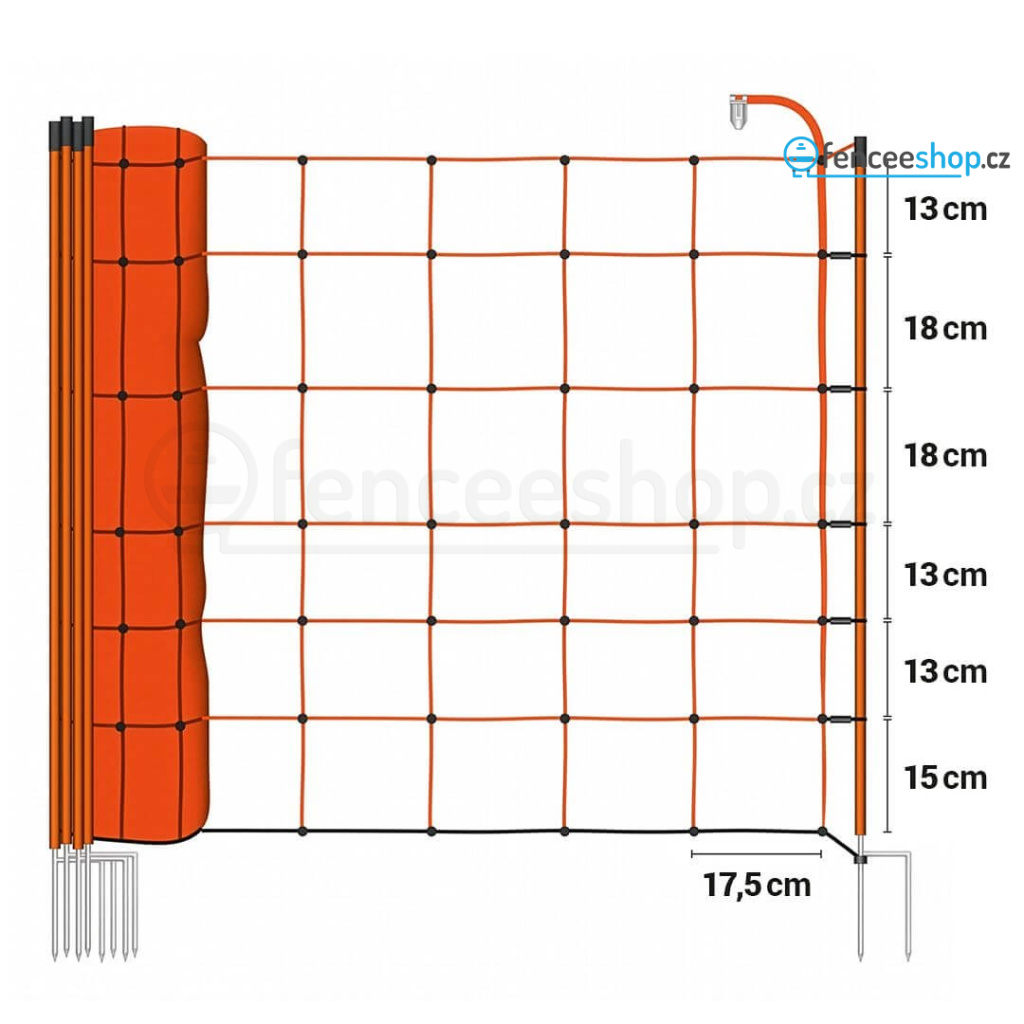 Elektrická síť má 14 tyčí se dvěma hroty pro lepší stabilitu. Je určená primárně pro ovce a kozy, lze využit i pro prasata. Standardní délka sítě 50 m, výška sítě 90 cm zabraňuje přeskočení. 8 vodorovných lanek s 3 × 0,20 mm silným nerezovým vodičem + 1 spodní řada (černé lanko) je nevodivé, izoluje. Doplňte ohradníkovou síť o vizuální bariéru signální pásku - zradidlo.