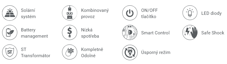 Solární napájení, nízká spotřeba a efektivní využívání baterie zajišťuje bezúdržbový provoz během hlavní pastevní sezóny od jara do podzimu. Ochrana proti hlubokému vybití baterie.