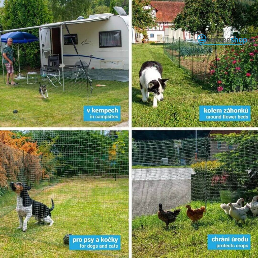 Díky snadnému sestavení a demontáži je fixní nevodivá síť ideální variantou pro přenosný výběh pro psa, plot na kempování nebo pro vymezení jednotlivých ploch. Pro ochranu mladých rostlin, okrasných záhonů, záhonků s rajčaty, zeleninou a plodinami.