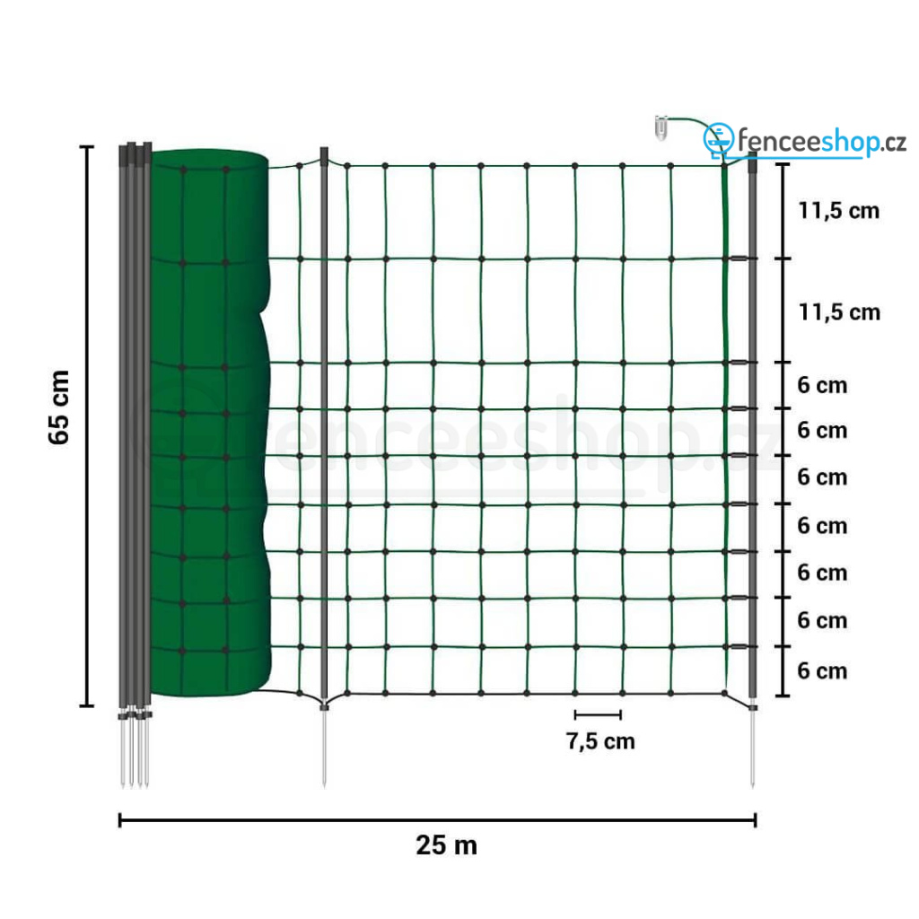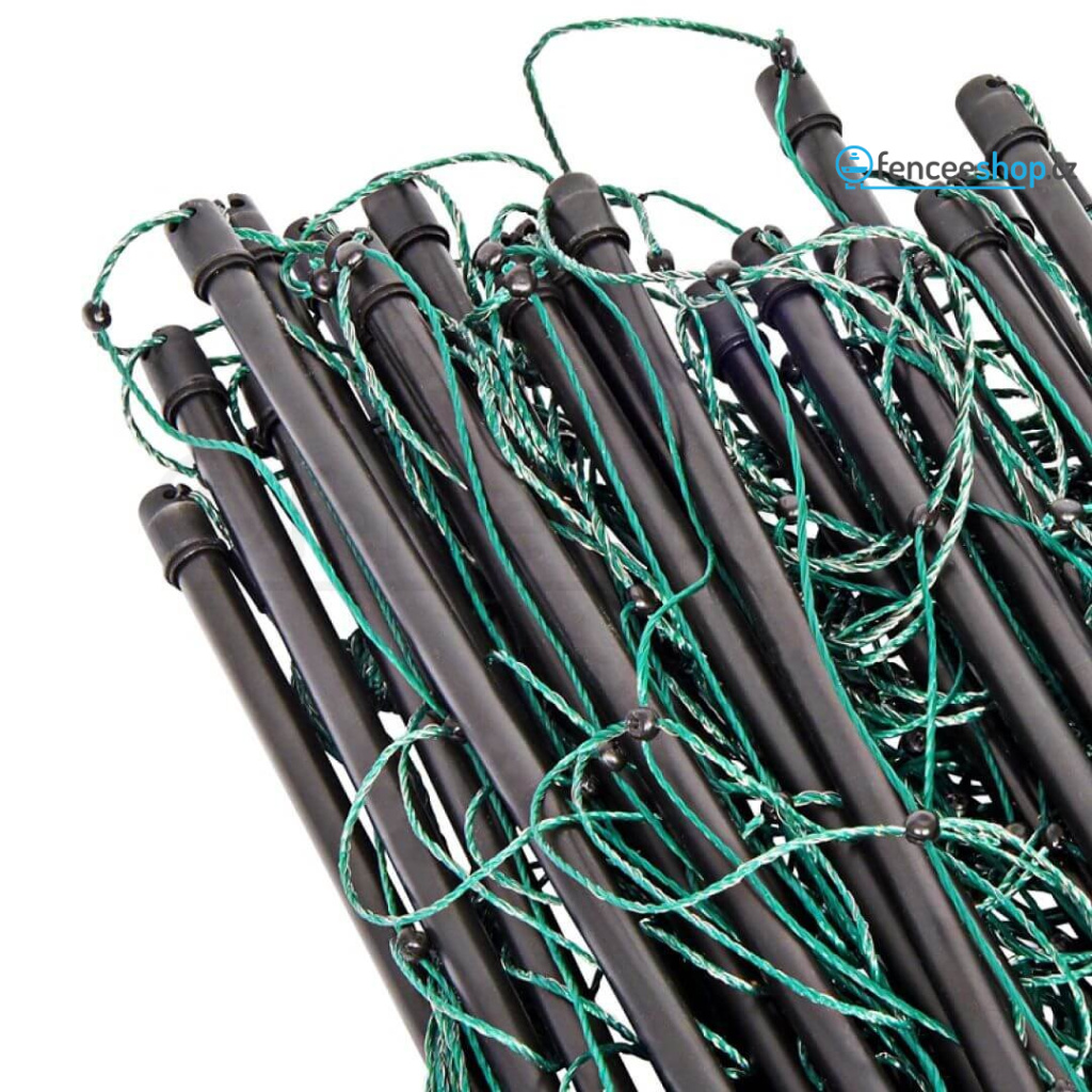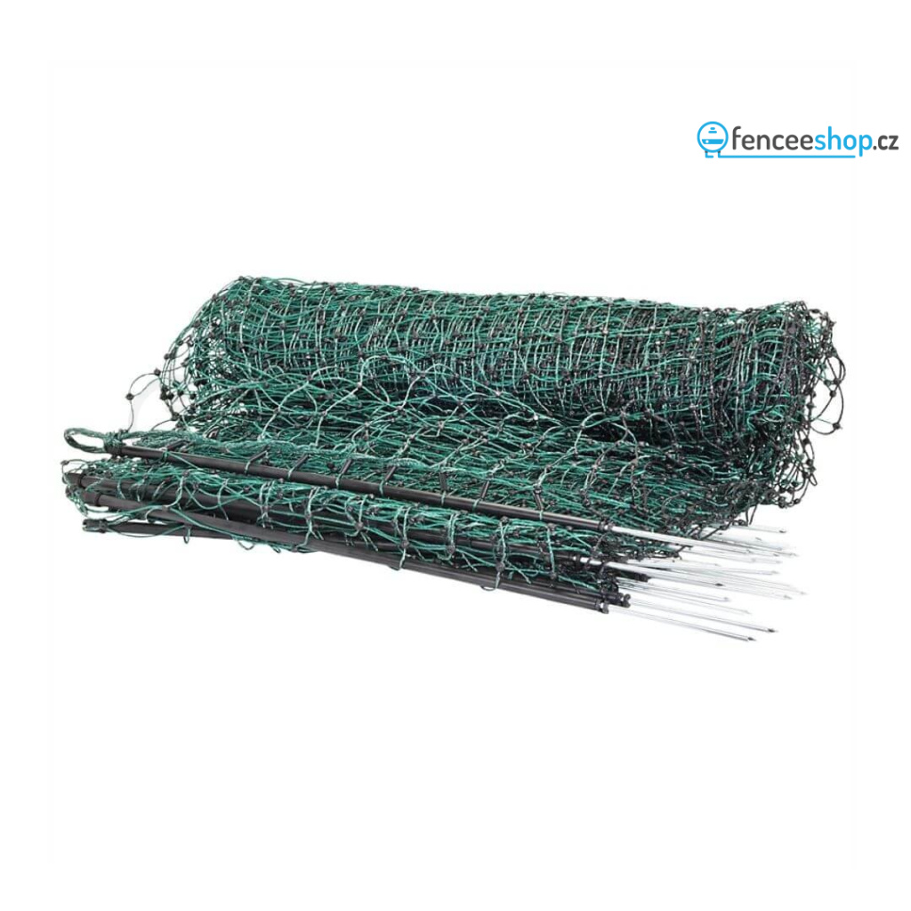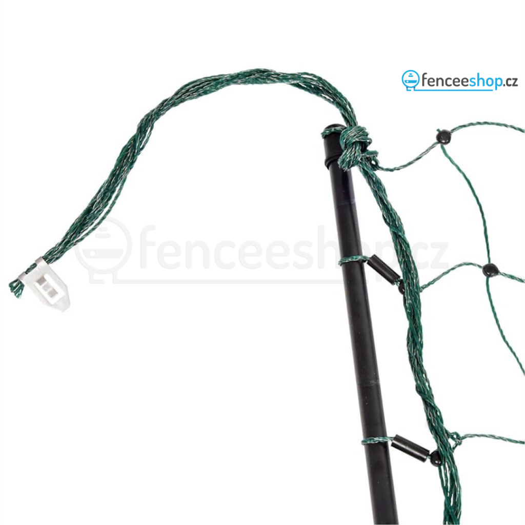 Síť pro elektrický ohradník v délce 25 m pro psy, králíky a kočky. Obsahuje celkem 9 tyčí s jednoduchým hrotem a 10 vodorovných vodivých lanek s 3 × 0,20 mm nerezovým vodičem + 1 spodní řada (černé lanko) je nevodivé, izoluje. Včetně sady na opravu sítě. Více informací